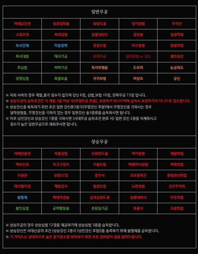 천년개인서버 일반무공 상승무공 원기점수표
